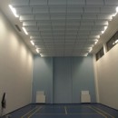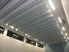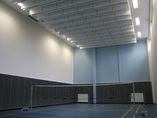 Komplexní návrh úprav prostorové akustiky badmintonové haly, dodávka a instalace stropních závěsných akustických prvků.
